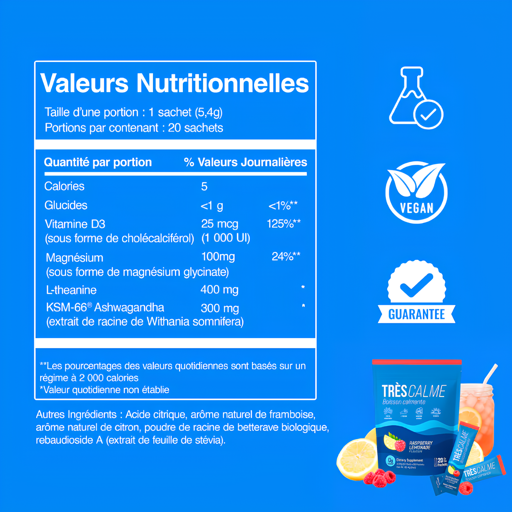TrèsCalme lutte contre un taux élevé de cortisol grâce à un mélange d'ashwagandha KSM-66®, de glycinate de magnésium, de L-théanine et de vitamine D3. Cette formule aide à réduire le cortisol, à diminuer le stress et à améliorer le sommeil.